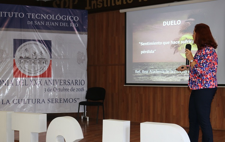 En esta conferencia, la Tanatóloga explicó primeramente el concepto de tanatología, las formas en que afecta a los seres humanos la pérdida de algún ser querido y las distintas maneras de "lidiar y superar" el duelo que ello provoca.