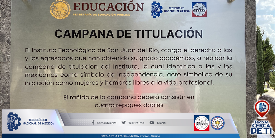 San Juan del Río, Qro. 31 de mayo de 2023, se realizó el acto de develación de la placa que identifica a la campana de Titulación del Instituto Tecnológico de San Juan del Río. Al repicar la campana de titulación simboliza la iniciación como mujeres y hombres libres a la vida profesional.