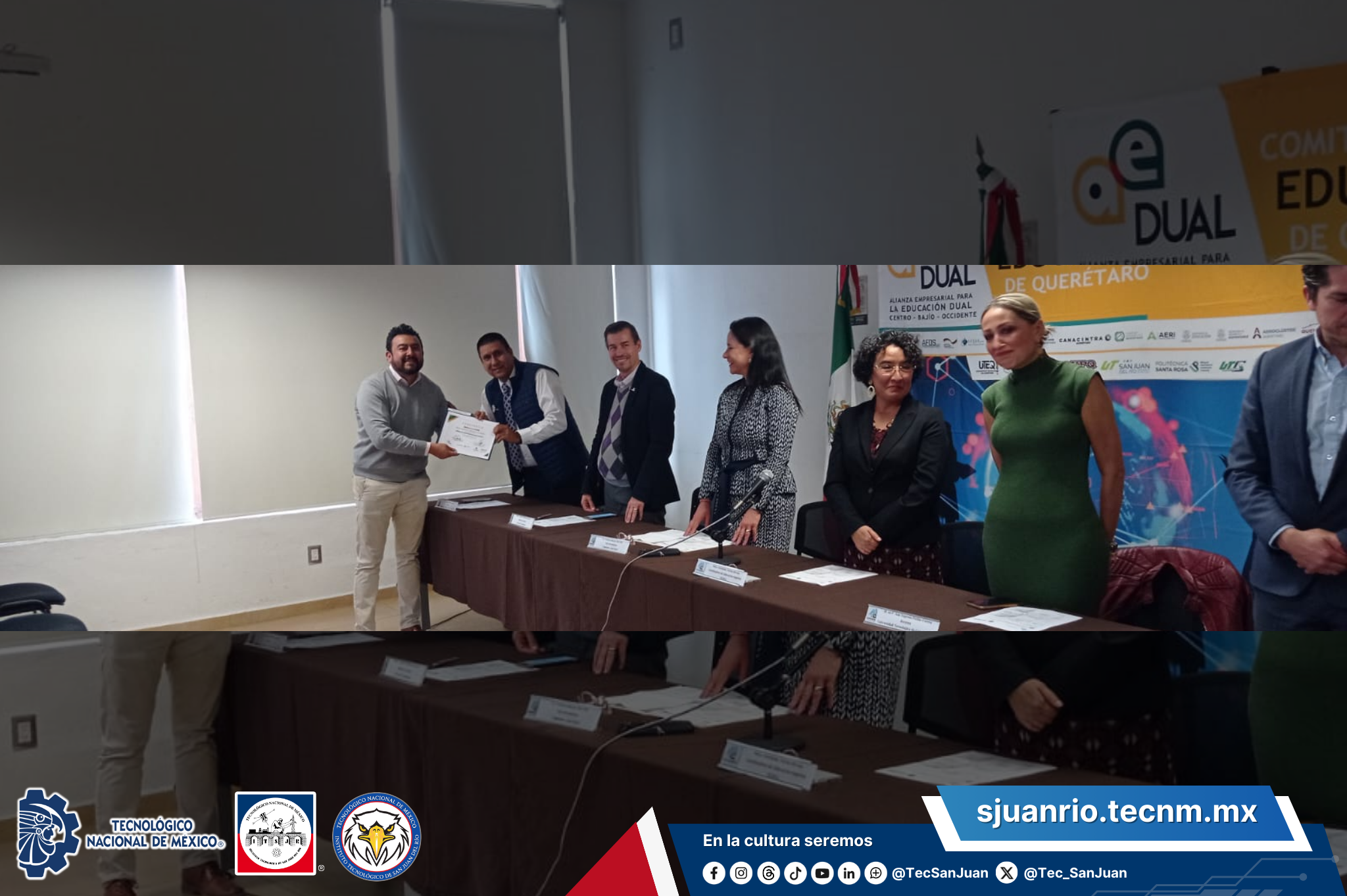 San Juan del Río, Qro. 16 de febrero del 2024. En un evento realizado en la ciudad de Querétaro en las instalaciones de COPARMEX, se hizo entrega de reconocimientos a docentes del Instituto Tecnológico de San Juan del Río que cuentan con la formación como docentes para la educación dual, entre los reconocidos se encontraron: Ángel Custodio Navarrete Fernández, Isidro Armando Hernández Zúñiga y Sahid Armando Méndez Guerrero.