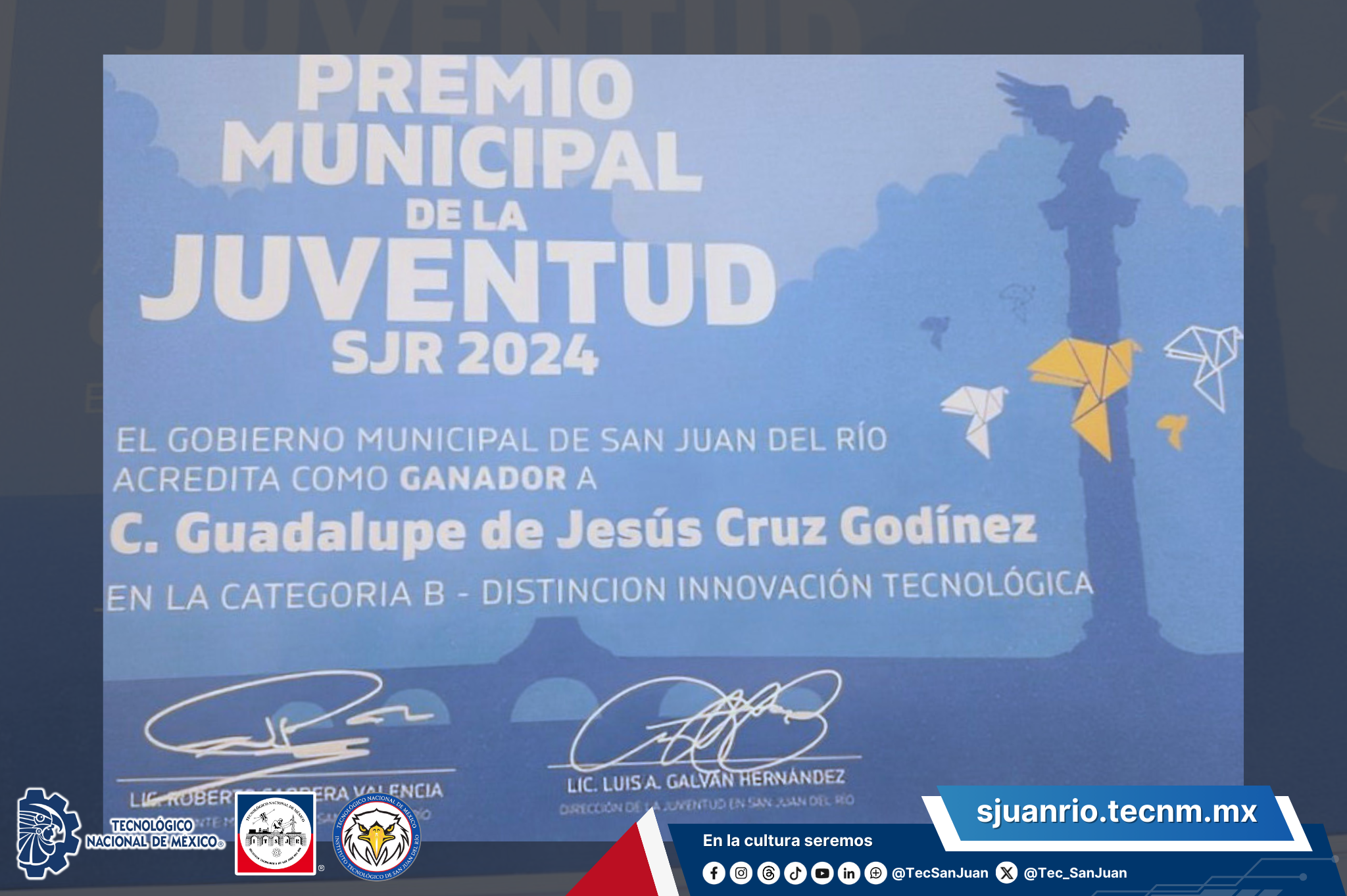 San Juan del Río, Qro. 17 de febrero del 2024, Guadalupe de Jesús Cruz Godínez estudiante de la carrera de Ingeniería en Gestión Empresarial, recibe el Premio Municipal de la Juventud San Juan del Río 2024, en la categoría Distinción por Innovación Tecnológica.