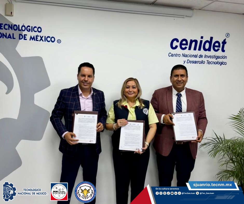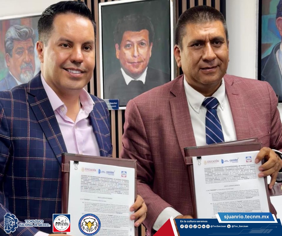 Cuernavaca, Mor. 16 de mayo del 2024 En un significativo paso para el fortalecimiento de sus programas de investigación de posgrado, el Instituto Tecnológico de San Juan del Río (ITSJR), encabezado por Rubén Espinoza Castro, director, firmó un convenio de colaboración con el Centro Nacional de Investigación y Desarrollo Tecnológico (CENIDET) Cuernavaca, bajo la dirección del Dr. Arturo Ernesto Mares Gardea.