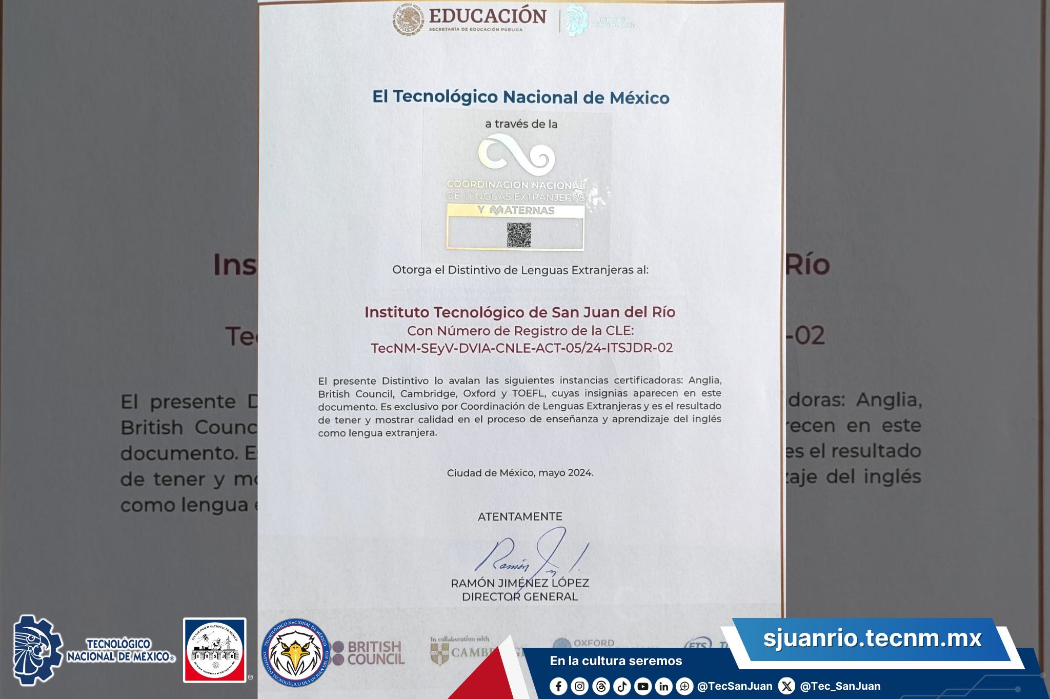 San Juan del Río, Qro. 30 de mayo del 2024 El Instituto Tecnológico de San Juan del Río (ITSJR) se complace en anunciar la renovación del Registro de la Coordinación de Lenguas Extranjeras, un logro que consolida su compromiso con la enseñanza de idiomas de alta calidad y el desarrollo profesional de sus estudiantes.