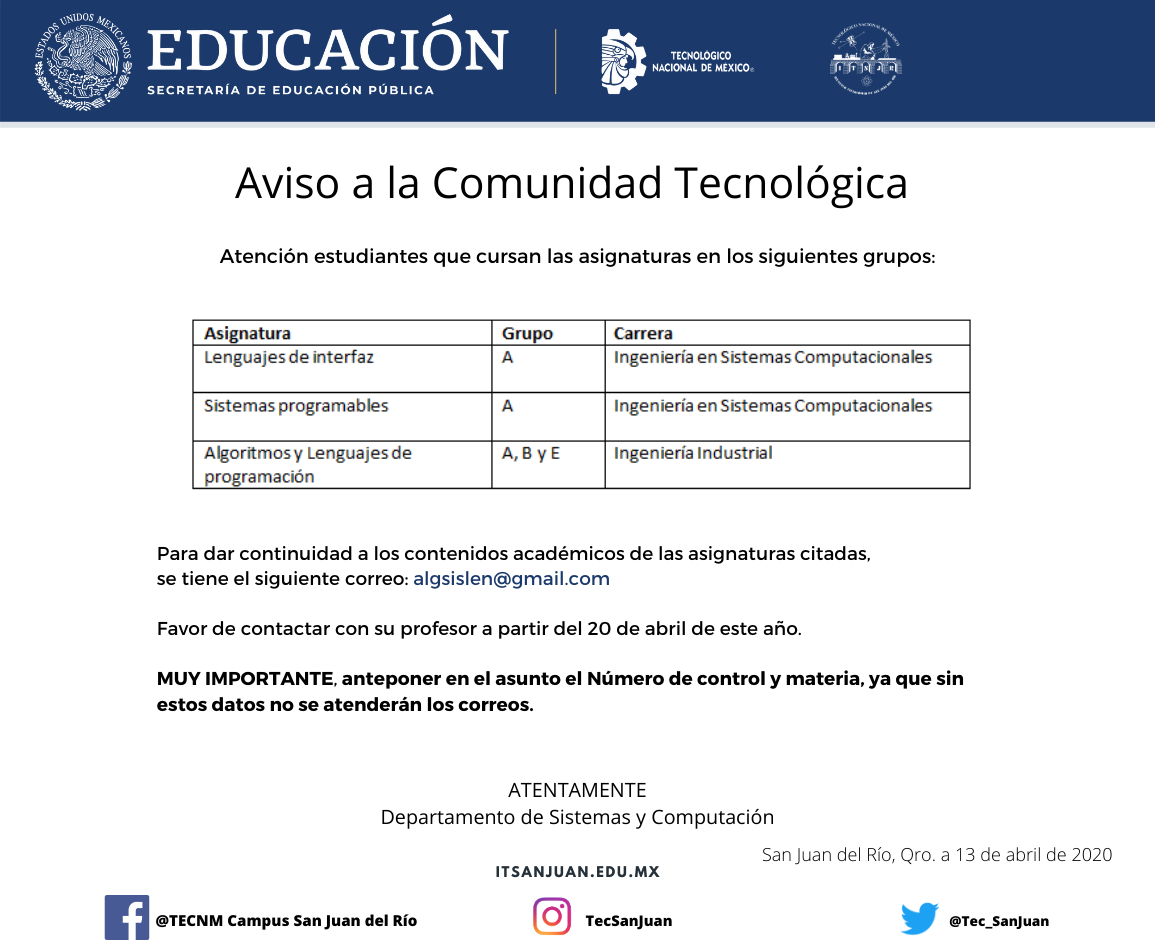 13 de abril de 2020 - Aviso a estudiantes de Ingniería Industrial y Sistemas Computacionales.