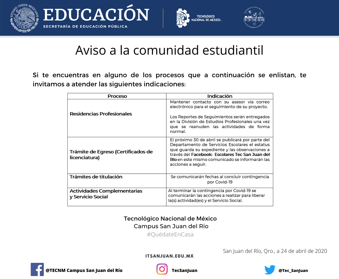 24 de abril de 2020 - Aviso a estudiantes en procesos de Actividades Complementarias, Servicio Social, Residencias y Titulación.