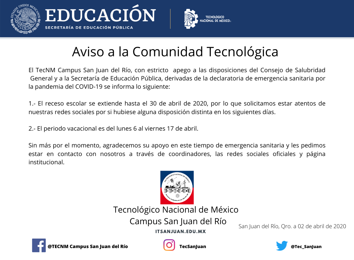 17 de marzo 2020 - Ajuste de calendario semestre Enero-Junio 2020 ITSJR