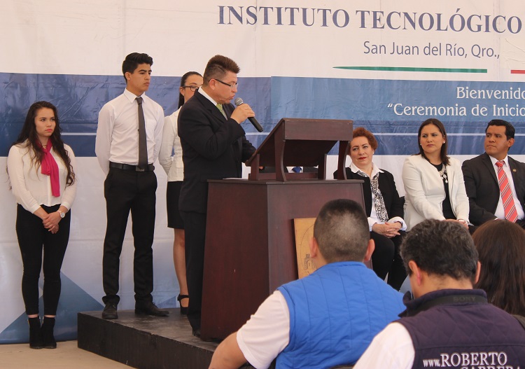 En el mensaje del Subdirector Académico del Instituto Tecnológico de San Juan del Río, el M.C. ÁNGEL ADAD FRANCO BALTAZAR agradeció la presencia de las autoridades, docentes, jefes de departamento, Presidentes de academia y personal de apoyo y de servicios, así como también a los nuevos estudiantes del Tecnológico. Comentó que el Tecnológico de San Juan de Río se esfuerza para dar respuestas positivas a las demandas de la educación moderna y formal, a través de los recursos que posee para promover el manejo, adaptación e innovación de formulas de trabajo y estrategias acordes con la modernización tecnológica e industrial. Les dió la bienvenida a los nuevos estudiantes y los exhortó a dar su mayor esfuerzo y aprovechen la oportunidad de ser formados como profesionistas innovadores, transformadores de realidades, portadores de soluciones a los múltiples retos actuales y poseedores de éxitos crecientes que engrandezcan a la sociedad y a nuestro méxico.